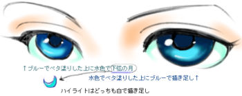 CG的なフィルタ等々の使い方も興味深く見て回りましたが、とにかく一番驚いたのは「目の塗り方」。イマドキの子は「濃い色を目玉全体に流し込んだあと、薄い色で下弦の月(←上弦の月だった…)を描いてぼかして、それからハイライト入れる」って描き方が主流なんでしょうか。