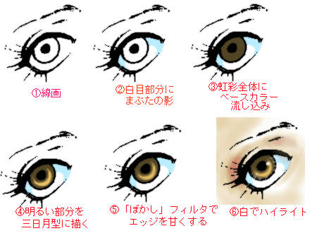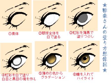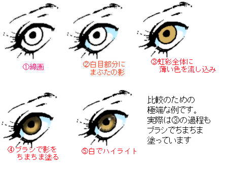 8月30日の日記をアップしたあと、「完成図の比較対照じゃ分かりにくすぎた…」と思って、作成過程を画像化して補足してみました。ちなみに線画は『女人礼賛』のキラ様のお目目。取り込み線画原寸です。