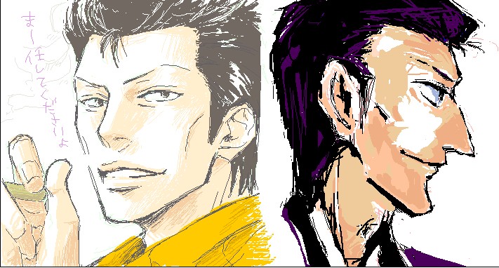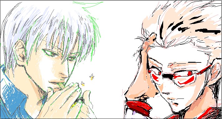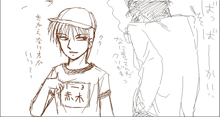 07年6月30日夜〜7月1日朝にかけて行った絵茶ログです。 参加してくださったヒダリさん、宵越さん、チャウチャウさん、飛尾さん、本当にありがとうございました! ![]() アカギ→宵越さん/平山→ヒダリさん 絵描きさんの素晴らしさを改めて実感しました……美しいアカギと可愛い平山!! ちなみにヒダリさんはマウスだけで描かれたそうです。未だに信じられません私! この時に出た「アカギは何の色にも染まらないけど、逆に平山は染まりやすい」という話題に電流走る。 ![]() 左の矢木さん→宵越さん/右の矢木さん→ヒダリさん 矢 木 さ ん パ ラ ダ イ ス。画面いっぱいの矢木さんに大感激!! おふたりが「矢木さん描きます」と言ってくださった時は、どうしようかと思いました(嬉しすぎて) 字専門の私は拝見してるだけでホントにすみっません!!(描かれている最中は興奮して大騒ぎしてるだけでした) ![]() 13歳アカギ→チャウチャウさん/矢木さん→宵越さん 体操服アカギ(帽子付き)!!!!(しつこくリクエストしてしまいました焼き土下座) ここから始まったアカギと矢木さんのやり取りが、本当に可愛くてたまらない! ツンデレ☆で表情変わりすぎな矢木さんと、彼を余裕で翻弄するアカギ。 リアルタイムで展開される矢木アカに、必死でスクショを撮りまくってました。見逃した台詞があるかもしれないのが無念……!! でもこうしてページに載せてみると、枠線が切れたりついていたりで酷いことに!何かいい方法はないんだろうか……。 悩みながらも次のページに続きます。 絵茶ログその2へ 戻る |