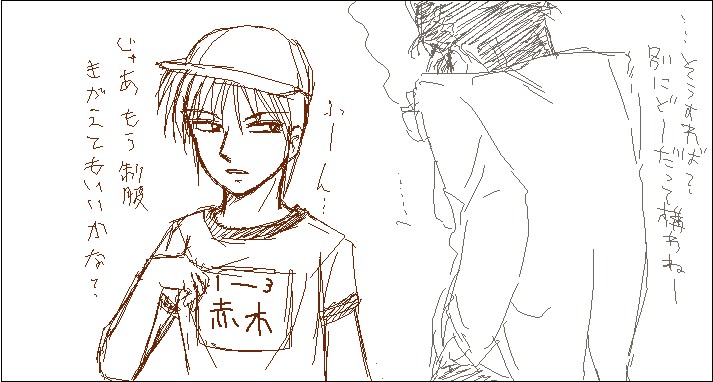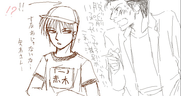 前ページの続きです。![]() いやいや、それは本心じゃないでしょ矢木さん……!(勝手に決めつけ) ![]() 淡々と着替えに入っちゃうアカギ。 ![]() 勢い余って、矢木さん問題発言!!! 「いっぱつやらせろ!」に萌えて萌えて悶えまくりでした。思わずピンクの「!?」で興奮を表現するハシノ。 ![]() 我に返る矢木さん。アカギにも突っ込まれてしまう。 矢木さんは「ああっ俺がこんなガキに!でも萌え、いや好き」と思って揺れているといい(萌えてるのか!?) その後でアカギの体操服を脱がしていく話になり……。 スクロールした先にアカギの半裸+事後絵があります。 ↓ ↓ ↓ ↓ ↓ ↓ ↓ ↓ ![]() 矢木アカ☆体操服プレイ!!! これを描いてくださった宵越さん最高っ……!!!!! 決してお母さんには見せられない(笑)、淫らな格好で過ごす矢木さんとの熱い一夜。 13歳にここまでしちゃうなんて矢木さんの野獣!けだものっ……!!(←ものすごい笑顔で) これ以来、「今夜はアレだろ、お前が体操服着る日だったよな……」「そうだっけ、ふふっ……」というやり取りが 矢木さんとアカギの間で交わされているに違いない!! めでたく体操服プレイ定番化!! 体操服プレイの話で盛り上がった後で宵越さんが退室され、入れ替わるように私を13歳受けにハメた飛尾さんが登場。 終盤は矢木アカに限らず色々な話題が出たりして、本当に楽しかったです。 告知が開催23時間前という、ほぼ突発な絵茶だったにもかかわらず たくさんの方々がお相手してくださって本当に嬉しかったです!! 最初から最後まで萌えすぎて大変なことになって……楽しい時間をありがとうございました!! 戻る |